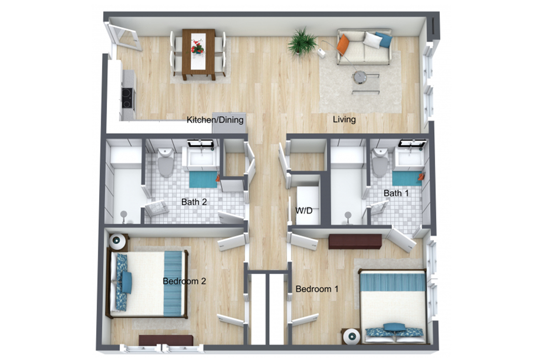 Private Bathroom Per Bedroom: Each student has own bedroom and bathroom; shared common areas (kitchen, living room)